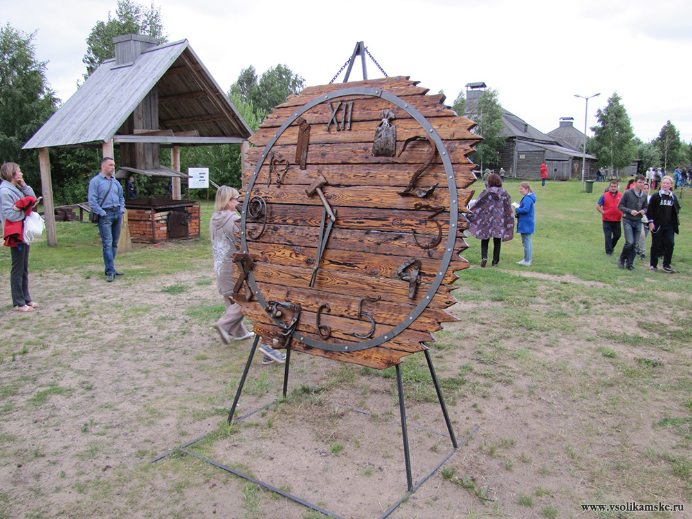 Вход платный, берем билет на оба дня за 140 рублей. На входе нас встречают часы, которые были сделаны на прошлых «Огнях Гефеста».