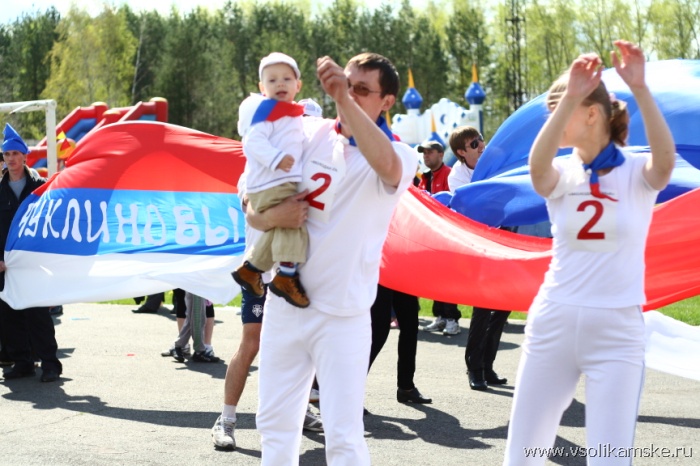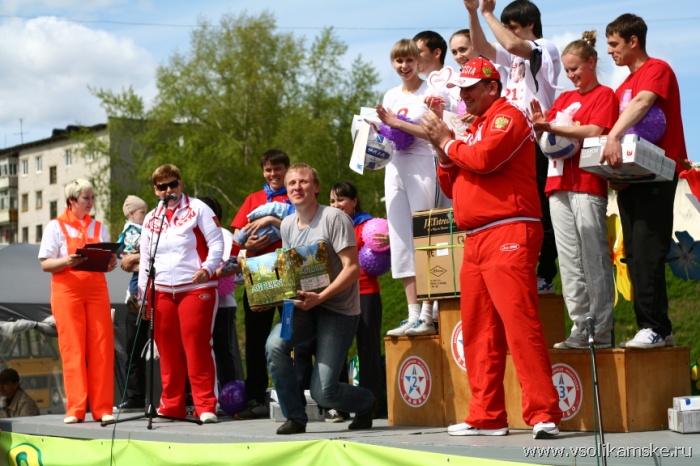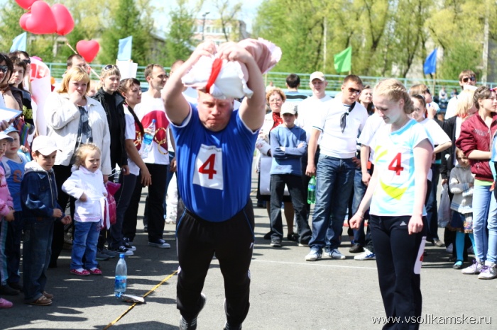 Под восторженные крики Михаил на руках поднимает Марину на пьедестал почета. Третью ступеньку на нем занимают Ольга и Максим Соловьевы, вторую – Мария и Алексей Антипины. Конкурс молодых семей продолжается.