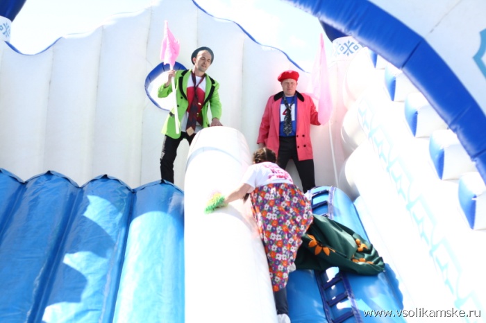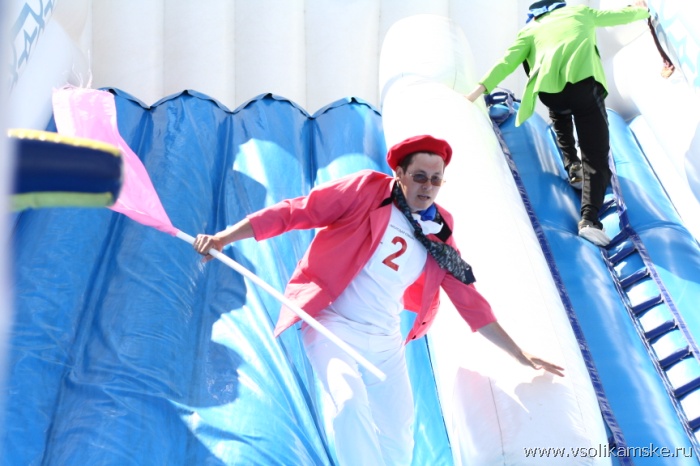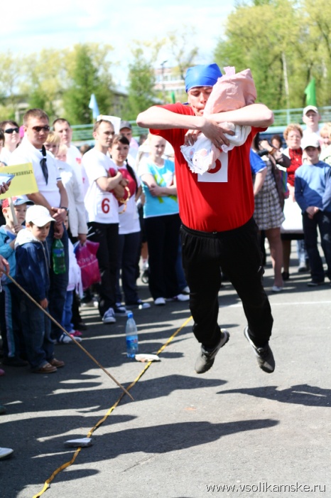 – За мной! – командует куратор конкурса Анастасия Чащихина, и дружной толпой супруги, члены жюри и многочисленные представители СМИ идут знакомиться с этапами шуточной эстафеты, которая проходит через два надутых батута… Обруч, скакалка, чуни, пиджак, чайник, шляпа, чашка, галстук, флаг, штаны, юбка, парик — от одного перечисления предметов, задействованных в задании, голова кругом идет. Но участники не теряются. Вот уже стартуют первые два папы: один батут «пройден» – и главы семейств в пиджаках, второй – на шеях галстуки. «А штанов-то нет!» – кричат они женам и отчаянно сигнализируют поднятыми вверх флагами. Вперед устремляются мамы со штанами, пришитыми к обручам…