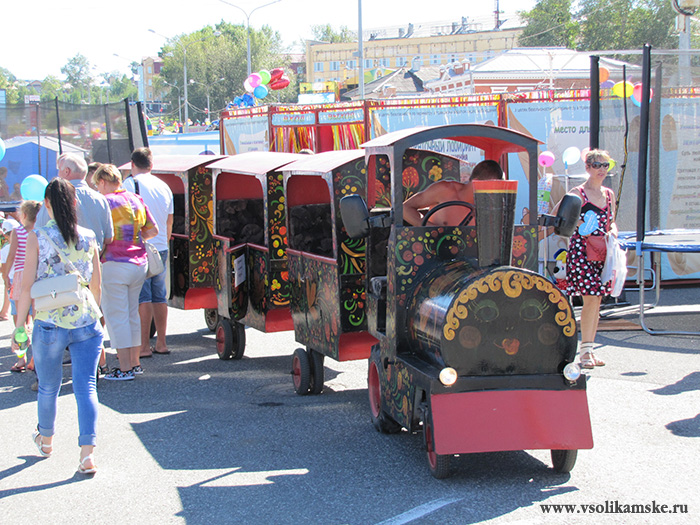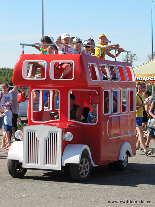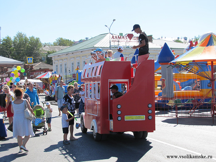 С Воскресенской площади стартовали паровозик и автобус. Да, в этом году кто-то из предпринимателей порадовал детей города поездкой на двухэтажном автобусе.