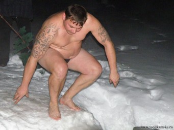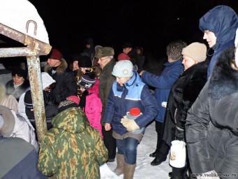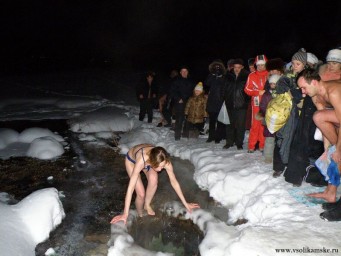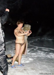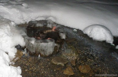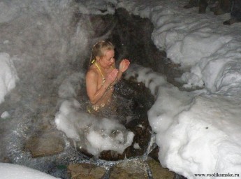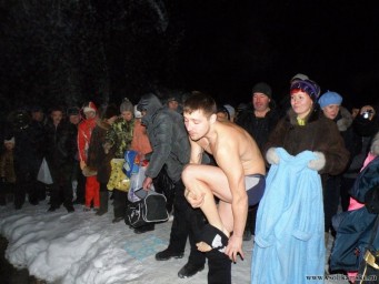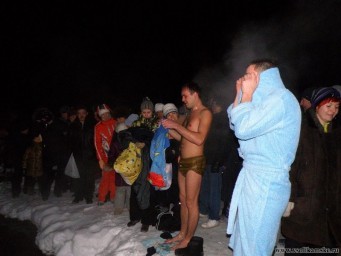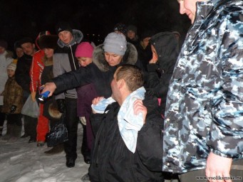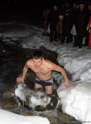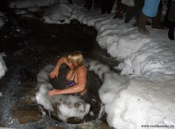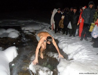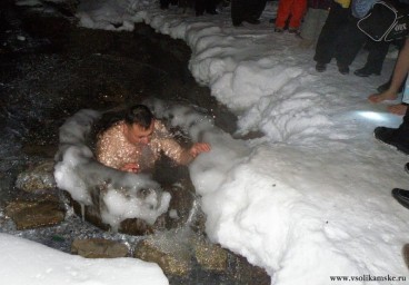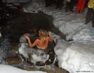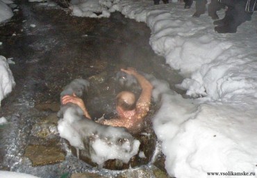 Людмилинская скважина. Соликамск. По традиции жители 3-го микрорайона окунаются в соляном источнике Людмилинской скважины. Края заледенели, выбираться очень трудно. Но это никого не пугает.