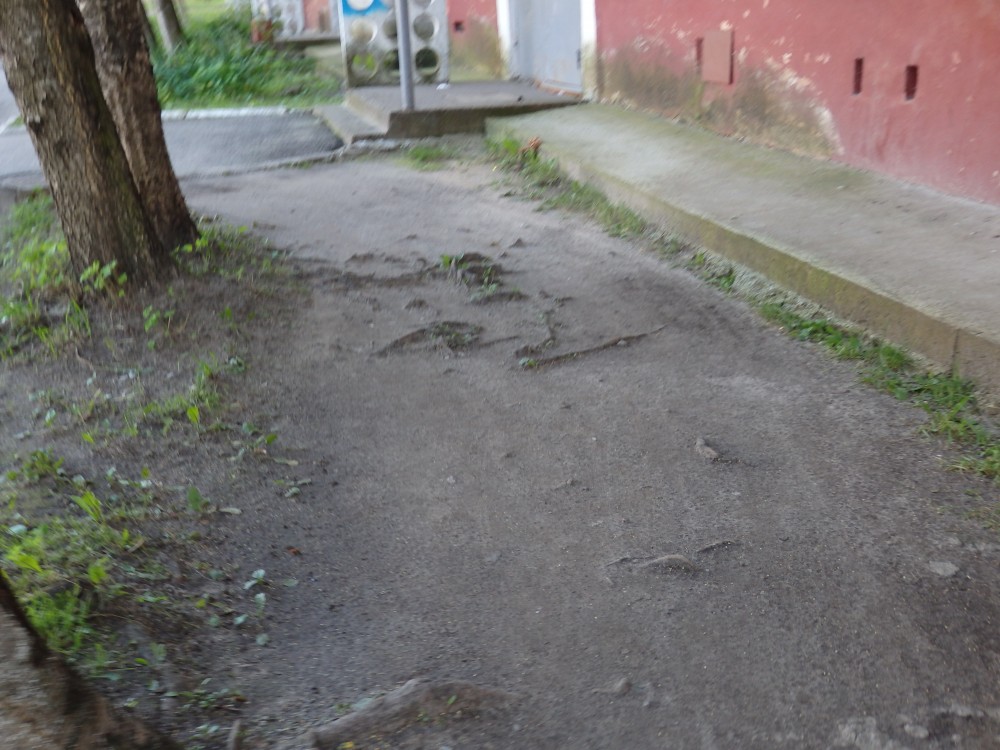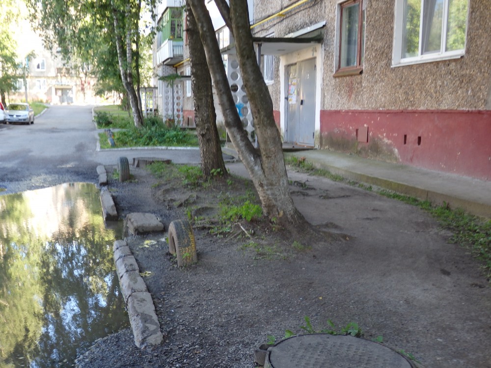 Еще один проблемный дом по Северной ниже детской поликлиники. Сегодня дождя нет, а лужи — в наличии. «Тротуар» (не знаю можно ли назвать тротуаром место, по которому постоянно ездят машины) здесь выполнен еще при постройке дома из бетона и явно нуждается в срочном ремонте! Кстати, во время дождя тут вообще полнейшая @опа..., а не дорога.