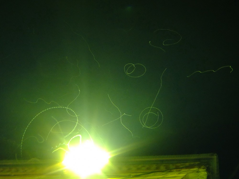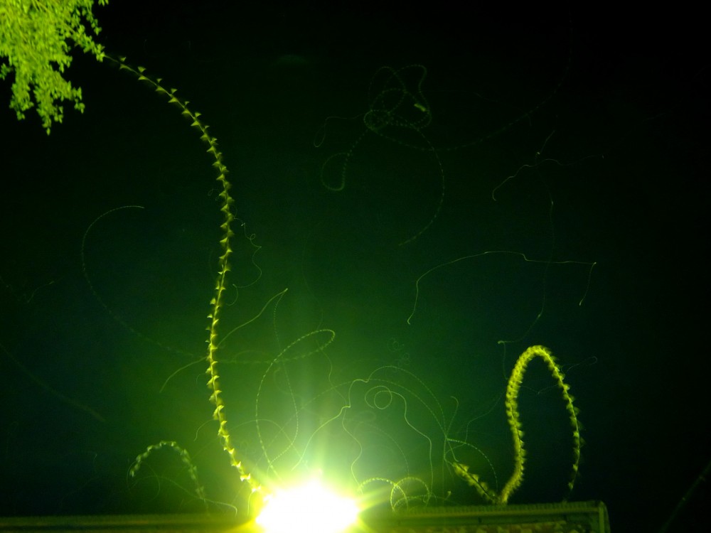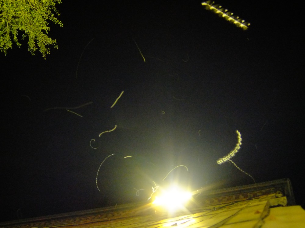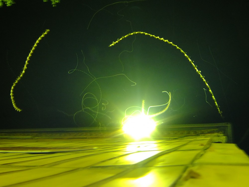 В одну из последних теплых ночей удалось заснять не характерную для нашей местности картину. Как правило, световые картины рисуют люди, но в данном случае их рисовали насекомые. Зрелище было завораживающее. Жаль, что под рукой не было штатива, да и ракурс был не очень удачный, но все же...