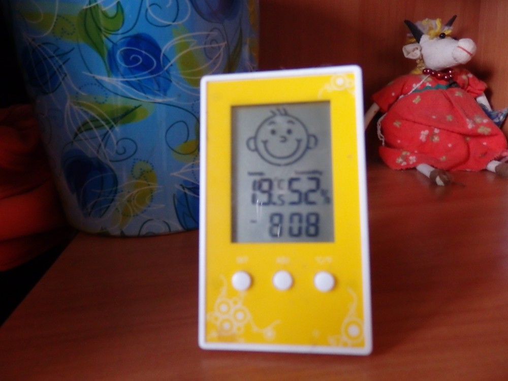 Кстати радиатор с задачей обогрева справляется не очень: помещение большое, включать на полную мощность — боюсь, ибо был неприятный опыт с возгоранием точно такого же радиатора. Вот какая температура в комнате при включенном радиаторе