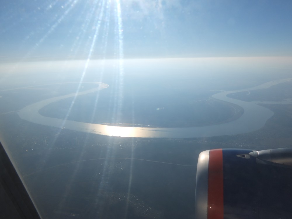 Заходим на Пермь со стороны Краснокамска (он под самолетом), впереди, в излучине реки находится Усть-Качка. К сожалению, в боковой иллюминатор попадает солнце, и блики мешают фотографировать.