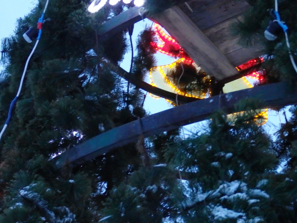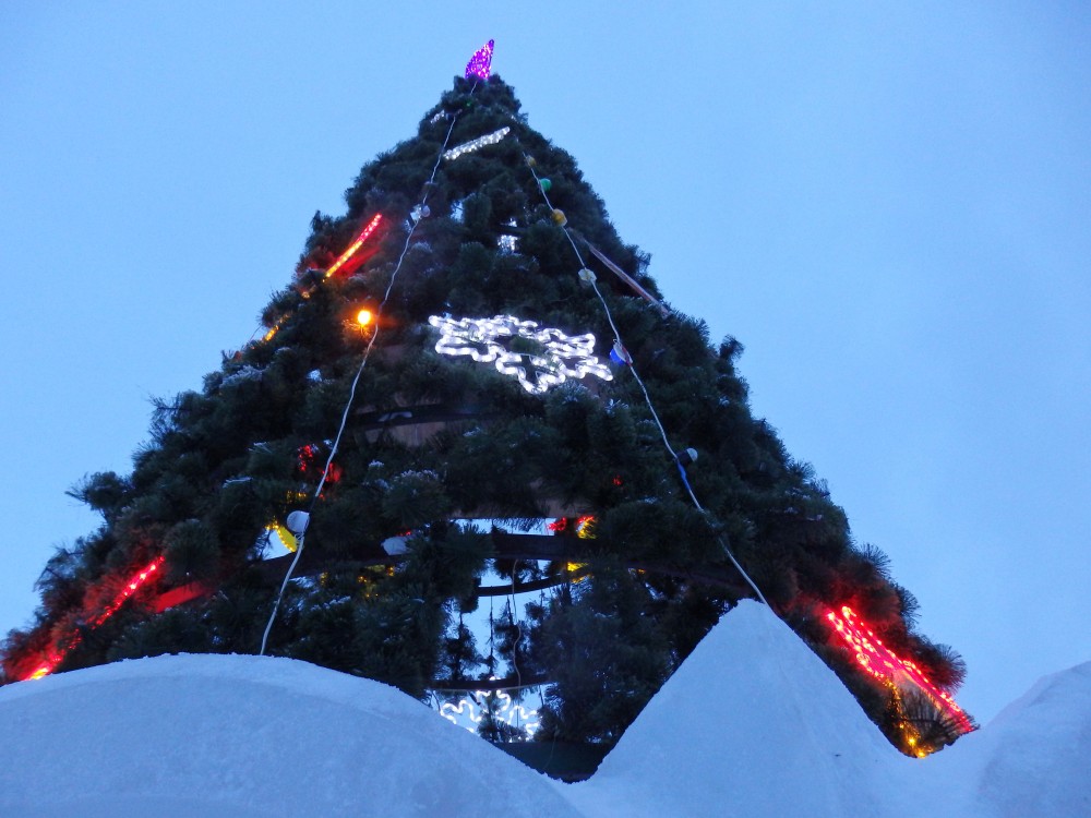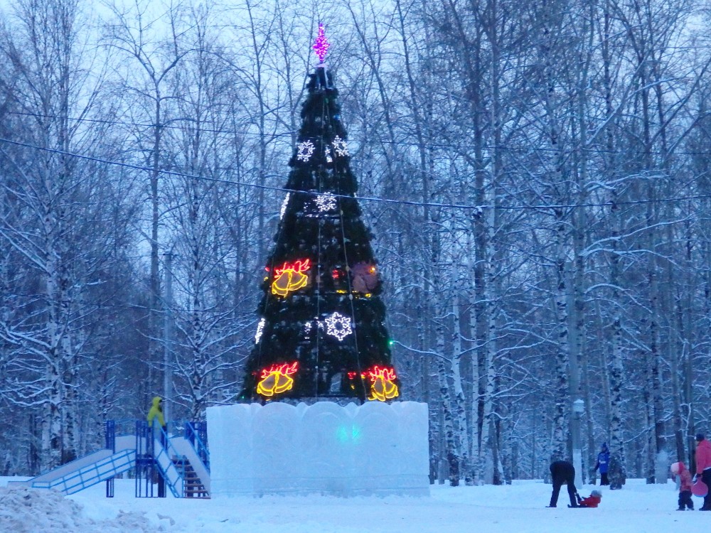 Дошли до елки в парке в Боровске. Первое, что бросается в глаза — какая же она куцая! Издалека смотрится красиво, но вблизи видно, что веток не хватает… растянули их по каркасу так, что прорехи видны то тут, то там...