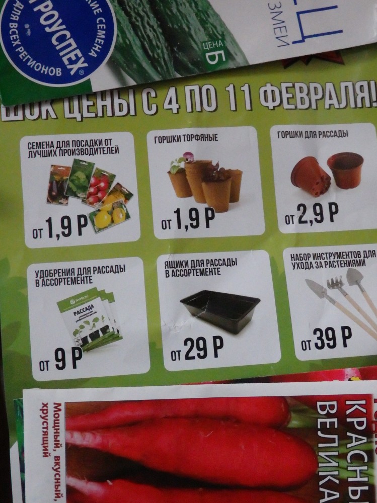 2) Почти во всех магазинах открыт сезон по продаже семян и товаров для садоводов.