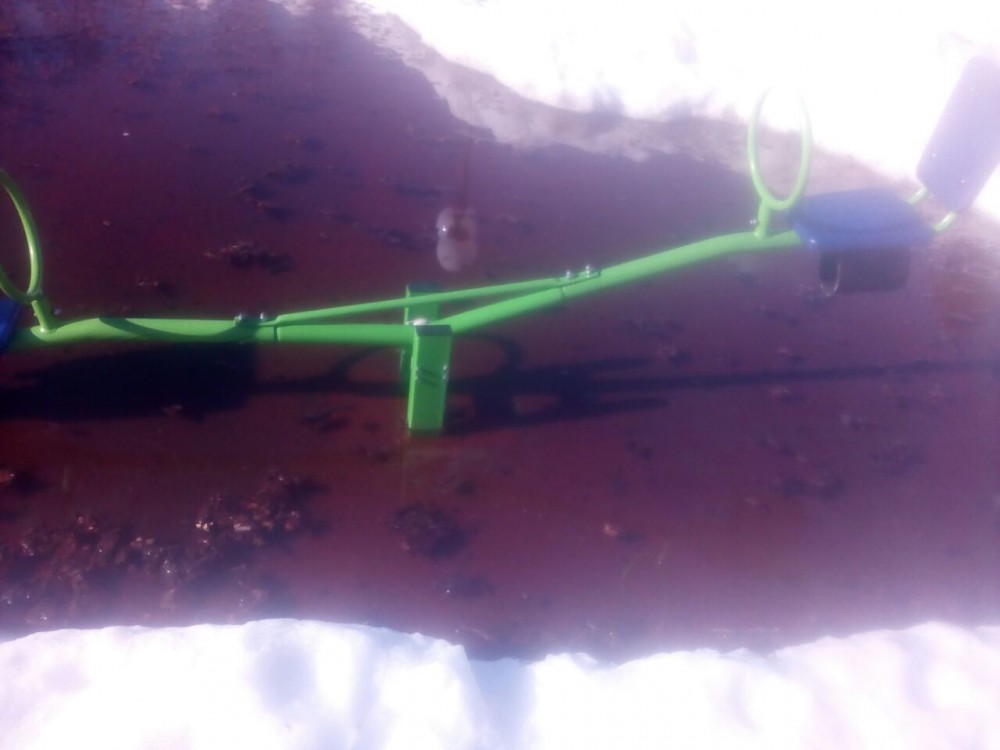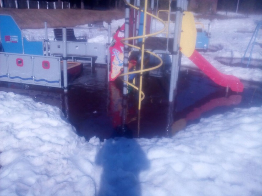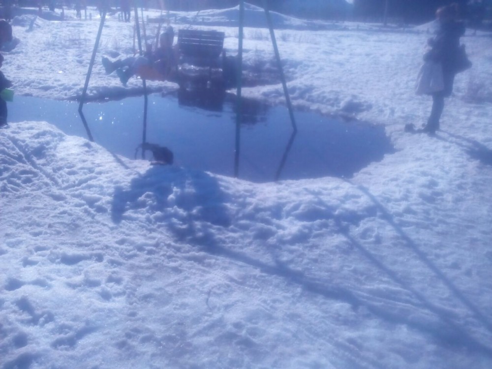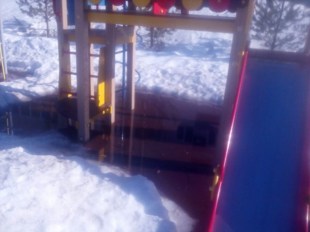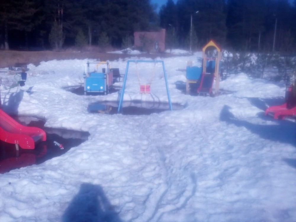 А пока лето не наступило, вот так выглядит детская площадка в селе Тохтуево возле ДК Альянс. Снег тает аккуратно вокруг горок, качелей, создавая под каждой из них лужи. Воды сантиметров по 10.