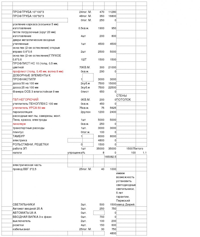 Наличие оказалось мифом… Но нас уверили, что вышлют нам прайс, чтобы мы могли понимать что к чему… Надо только написать им, чтобы у них появился наш адрес электронной почты. Я тут же написала. И ни ответа, ни привета, никакого прайса… Ждала 3 дня, позвонила снова, говорю, что готова отправить им чертеж, меня заверили, как только будет чертеж, тут же всё обсчитают и будут готовы заключить договор на изготовление. Отправила чертеж, но ни ответа, ни привета… Через 4 дня муж сам поехал к этому продавцу, тот, как оказалось, даже и не читал нашего письма… Открыл лишь при муже! Сказал, что можно всё удешевить, например вместо уголка использовать профтрубу… Мы-то думали на самом деле будет подешевле, чем их «готовый» вариант с авито. К концу дня получили расчет бытовки. Многие позиции смутили… где же это они дюймовку в городе по таким завышенным ценам видели? Окна столько не стоят, а на 550 рублей дешевле, загадочные транспортные расходы в 3 тыс — это за что? Работу оценили в 35 тыс)) и две итоговых суммы порадовали — одна 150 тыс, вторая 165… нехилая такая дешевизна...
