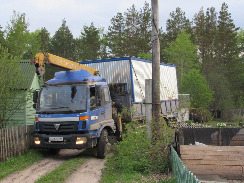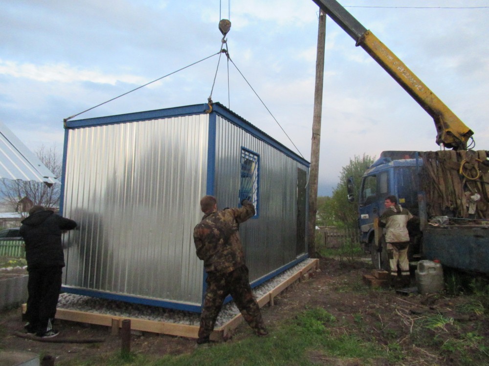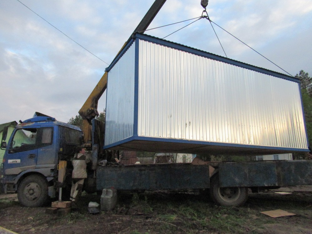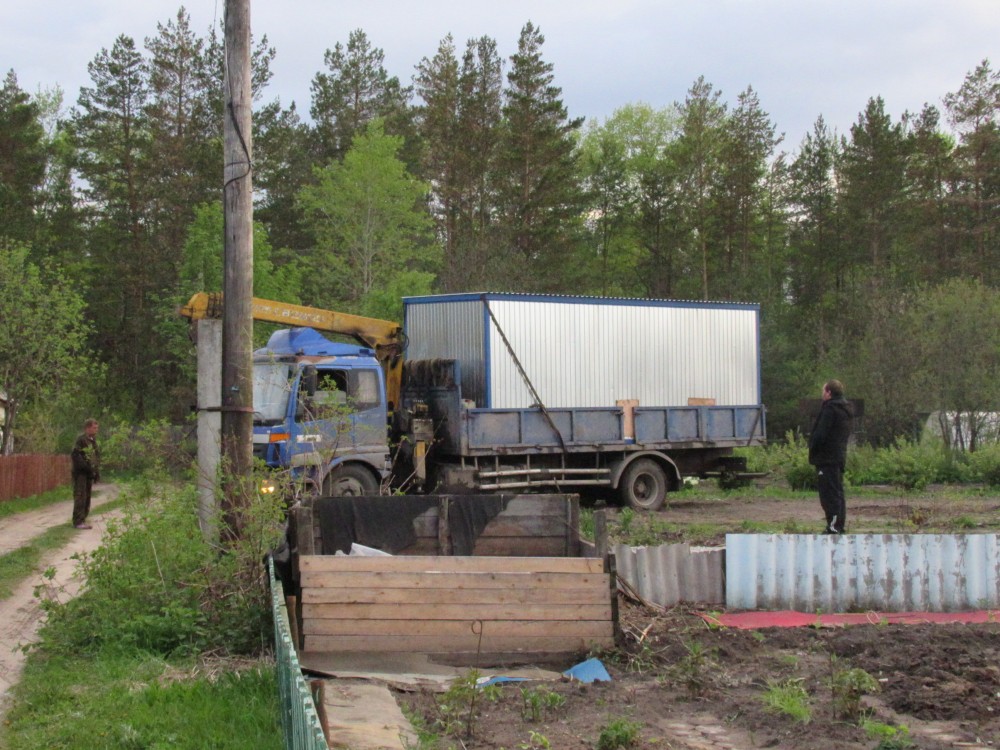 Как и было заявлено в договоре, спустя 14 дней, наша бытовка была готова. немного пугал вопрос оплаты — а вдруг я отправлю деньги, а бытовку мы не получим — возможности ехать самим в Пермь не было. Мы воспользовались доставкой производителя. И чтобы мы не переживали, оставшуюся часть оплаты производитель нам разрешил сделать при получении бытовки в Соликамске наличными. Поволноваться в тот день конечно пришлось. При погрузке бытовки на базе у кран-борта сломалась стрела! Парни — молодцы! До 17.00 смогли устранить поломку и таки привезли нам в положенный день бытовку! А как виртуозно они на 10-метровой машине смогли заехать на наш участок и ничего не помять у соседей!