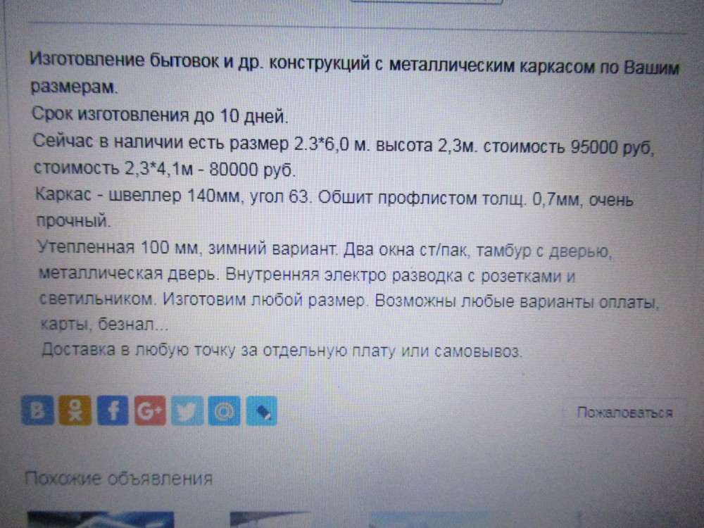 Поехали в Березники, смотреть бытовки б/у. Объявление нашли тоже на авито. Продавец говорил, что в наличии их на выбор много, надо лишь приехать и выбрать… Приехали в Березники. Продавец даже не подъехал к месту нахождения бытовок. Их оказалось в наличии лишь две, двери нараспашку, зашли — посмотрели… впечатления — не очень. У обеих протекли крыши, все внутри обшарпано, затаскано, стекла выбиты… и за такое просят 50-60 тыс… Отношение продавца тоже оказалось странным. Мог и подъехать, показать, если заинтересован продать. Но нам лишь адрес базы назвали и всё! Мы в базах не ориентируемся березниковских, вдруг там еще где были бытовки. А мы ехали с деньгами, готовы были купить сразу, но не получилось.