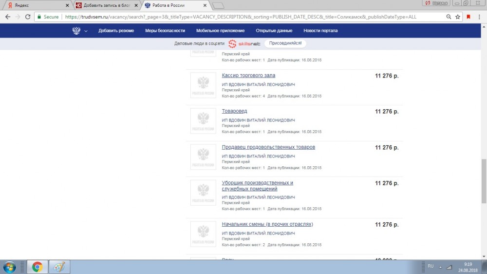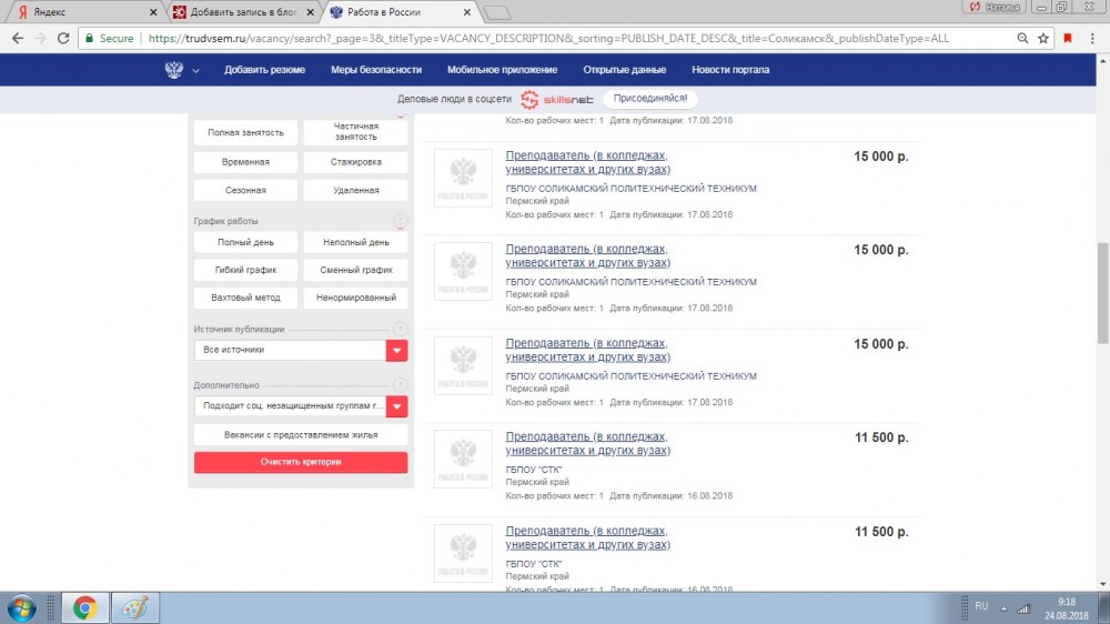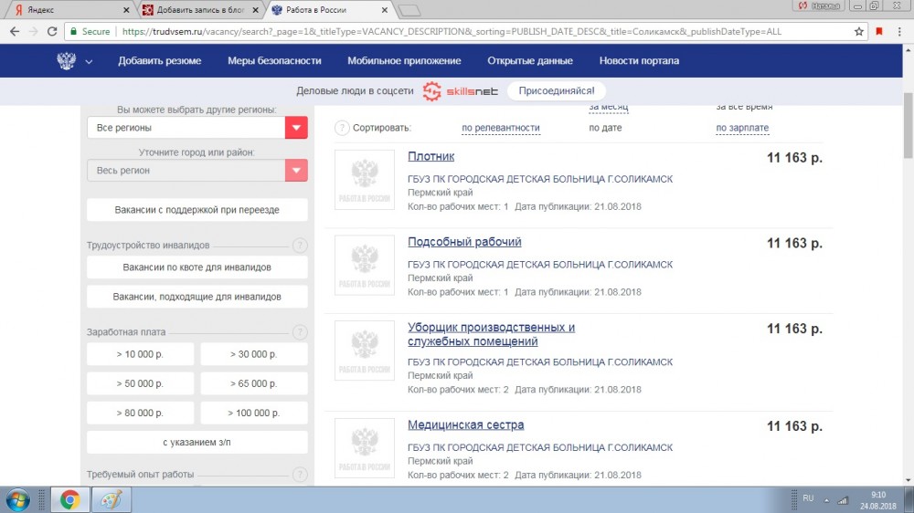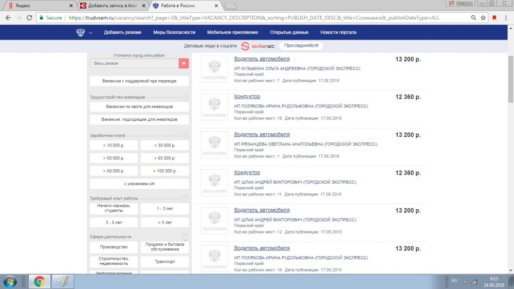 Идти туда нужно, если вы хотите встать на учет или желаете попасть на курсы переобучения. А вся информация о доступных вакансиях сегодня есть в интернете на сайте Работа в России: https://trudvsem.ru. Заходим на сайт, указываем место — Пермский край и город Соликамск. (Из личных наблюдений, в мобильной версии сайта вакансии отражаются с некоторым запозданием, не знаю почему). Сегодня на сайте представлены 643 вакансий - 1909 рабочих мест. Не все они конечно свободны, часть уже занята. Что же предлагает соликамцам, ищущим работу, ЦЗН и сайт Работа в России? Удивляет как много требуется водителей на городские маршруты и кондукторов: должность одна, а требуется 16, 11, 7 работников...