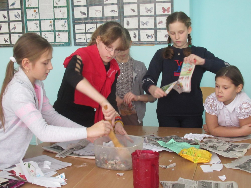 С некоторым недоверием поначалу отнеслись дети к мастер-классу по изготовлению бумаги своими руками. Процесс на самом деле не очень сложен. Вам понадобится любая макулатура (рвем на мелкие кусочки и заливаем водой). Можно добавить опавшие листья или траву. Добавляем в смесь ложку крахмала или клея ПВА, чтобы будущий продукт не распадался, заливаем бутылочку перекиси водорода — для отбеливания, иначе цвет бумаги будет слишком темный и вы не сможете на ней ничего написать. Полученную смесь «взбиваем» блендером до получения кашицы и раскладываем тонким слоем на газете. Толщину можно регулировать с помощью пресса или скалки — раскатайте до нужного вам уровня толщины. Оставьте сушиться. Уже через сутки у вас будет готовая бумага.