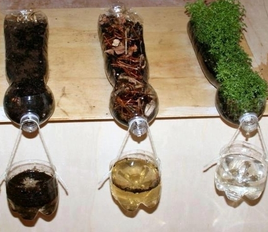 Своими глазами увидели ребята к чему приводит вырубка лесов: берем три пластиковых бутылки, вырезаем часть серединки по вертикали с одной стороны. В одну бутылку сажаем кресс-салат или любое растение, которое за некоторое время разрастается хорошо. Вторая бутылка наполнена простой землей. третья — камнями, ветками и сухими листьями. К горлышку каждой бутылки привязана некая тара, если мы начинаем лить воду в каждую бутылку, то наглядно видим, как земля, которую не держат корни растений вымывается...
