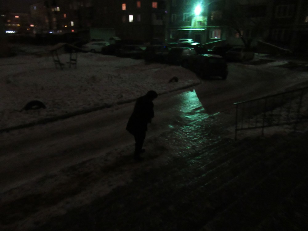 Еле-еле спускаемся, держимся за перила тоже все покрытые льдом и начинаем скользить к детскому саду… Дело осложняется тем, что путь — с горки. По дороге в детсад встречаем лабрадора с хозяином: собака растеряна, лапы скользят, пес то и дело падает(((