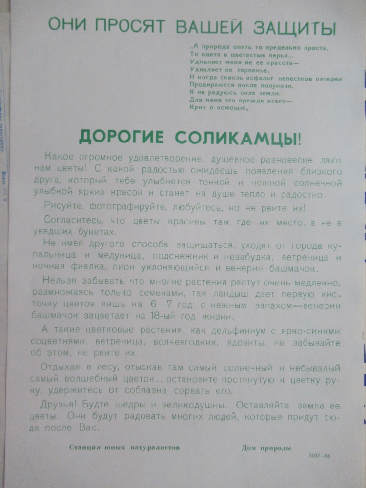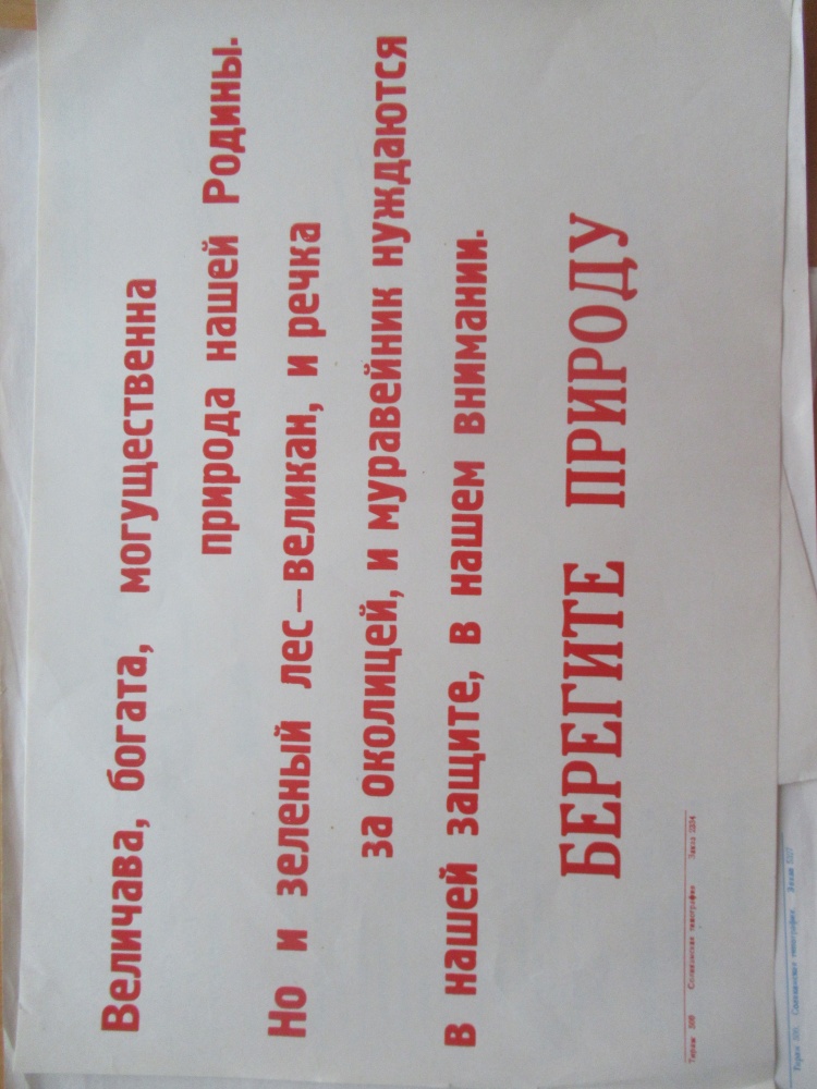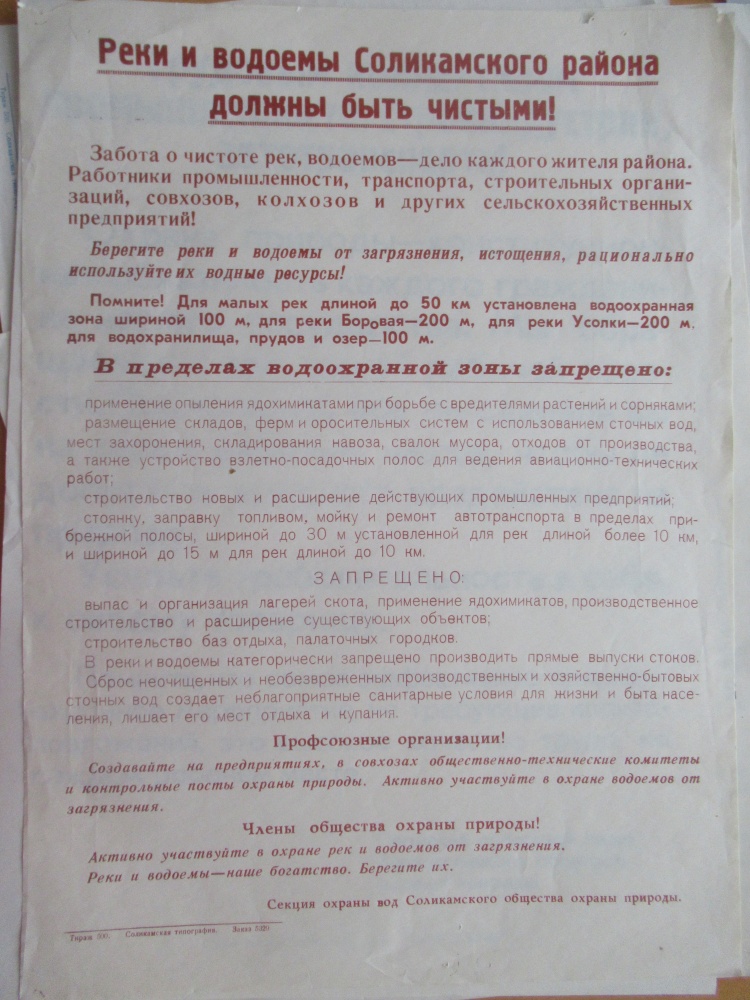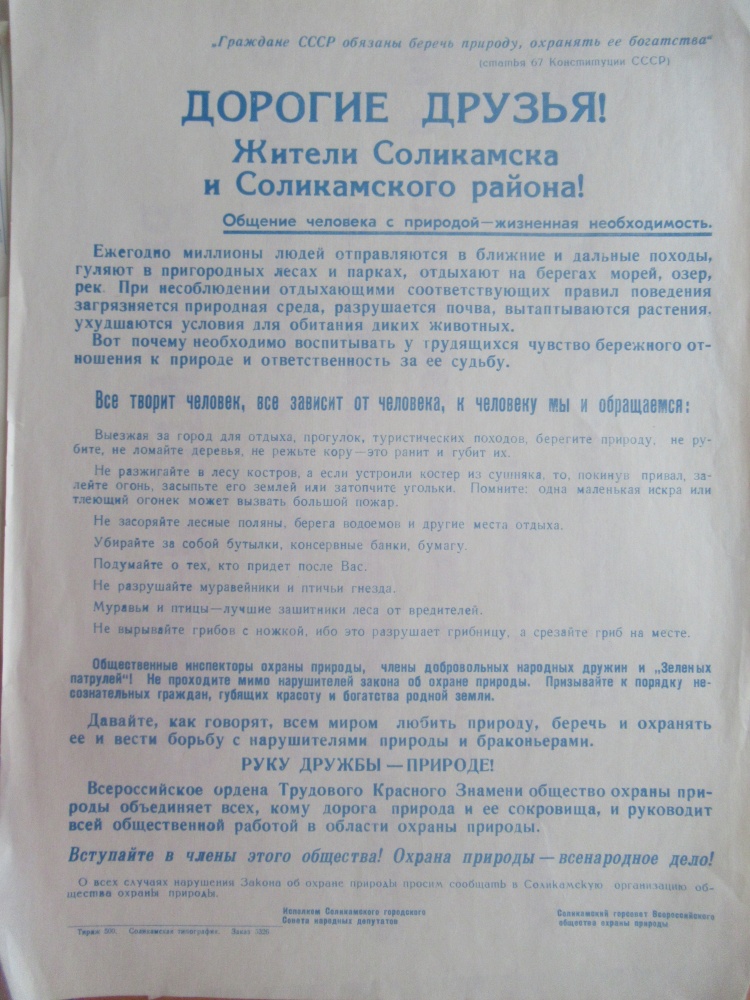 На плакатах фигурирует «Дом природы», секция охраны вод Соликамского общества охраны природы, Секция озеленения Соликамского горсовета Всероссийского общества природы, Станция юных натуралистов… Это ж сколько разных обществ, занимающихся охраной природы было! Покопалась ради интереса в интернете и нашла информацию, что Соликамский горсовет Всероссийского общества природы был ликвидирован в 2011 году.