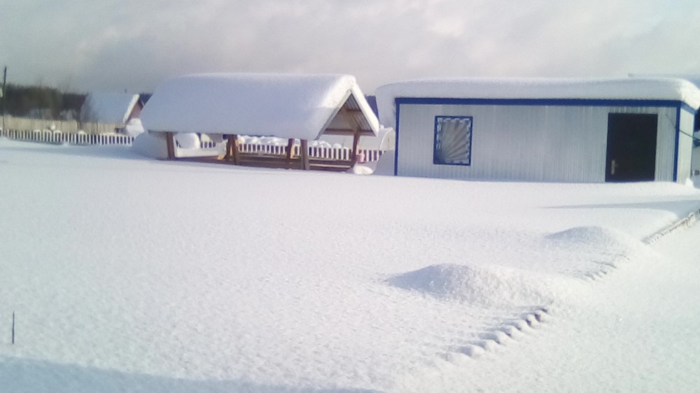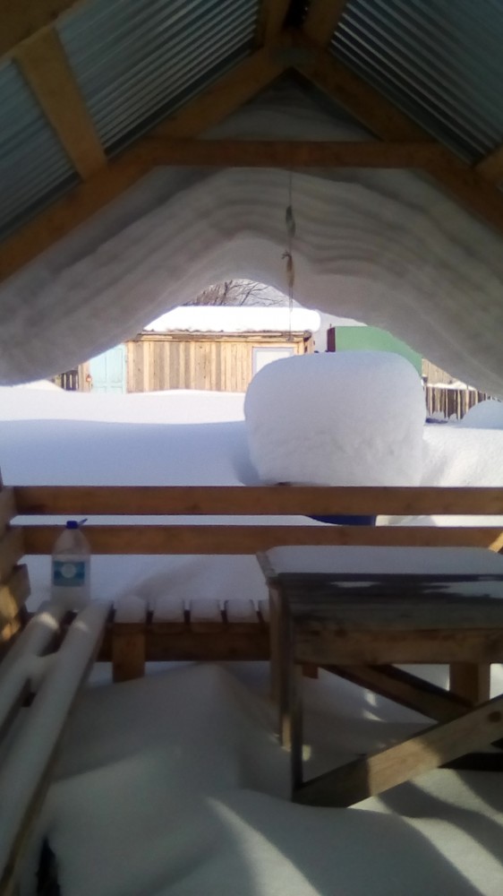 С беседки удалось счистить снег за 3 секунды) я просто стукнула по вот этому снежному наросту и снег рухнул со всей беседки, хорошо, что никто рядом не стоял.
