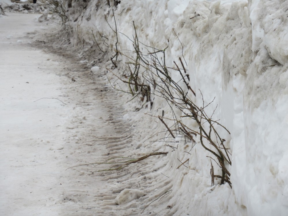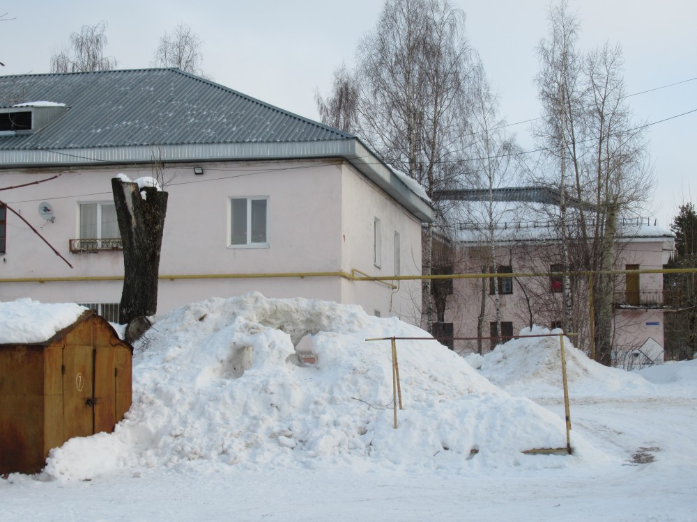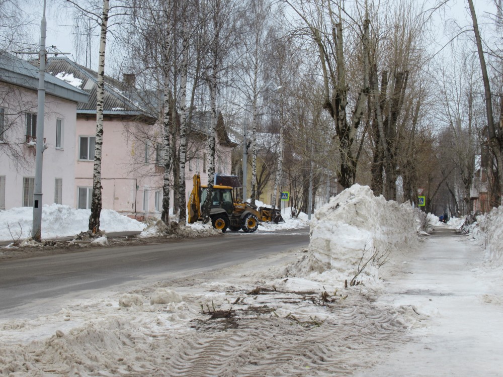 Коммунальные службы тоже трудятся — вывозят снег из города. На ул. Володарского так расстарались, что снесли кустарник, повредили стволы берез...