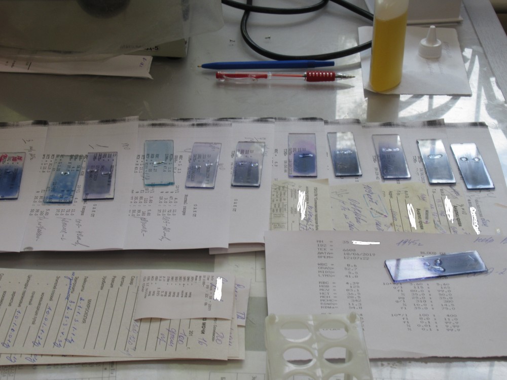 А это препараты, показывающие уровень гемоглобина. Чем бледнее синий цвет, тем меньше уровень гемоглобина в крови. К примеру, 4 слева образец — содержание гемоглобина — всего 55 при норме 120-140.