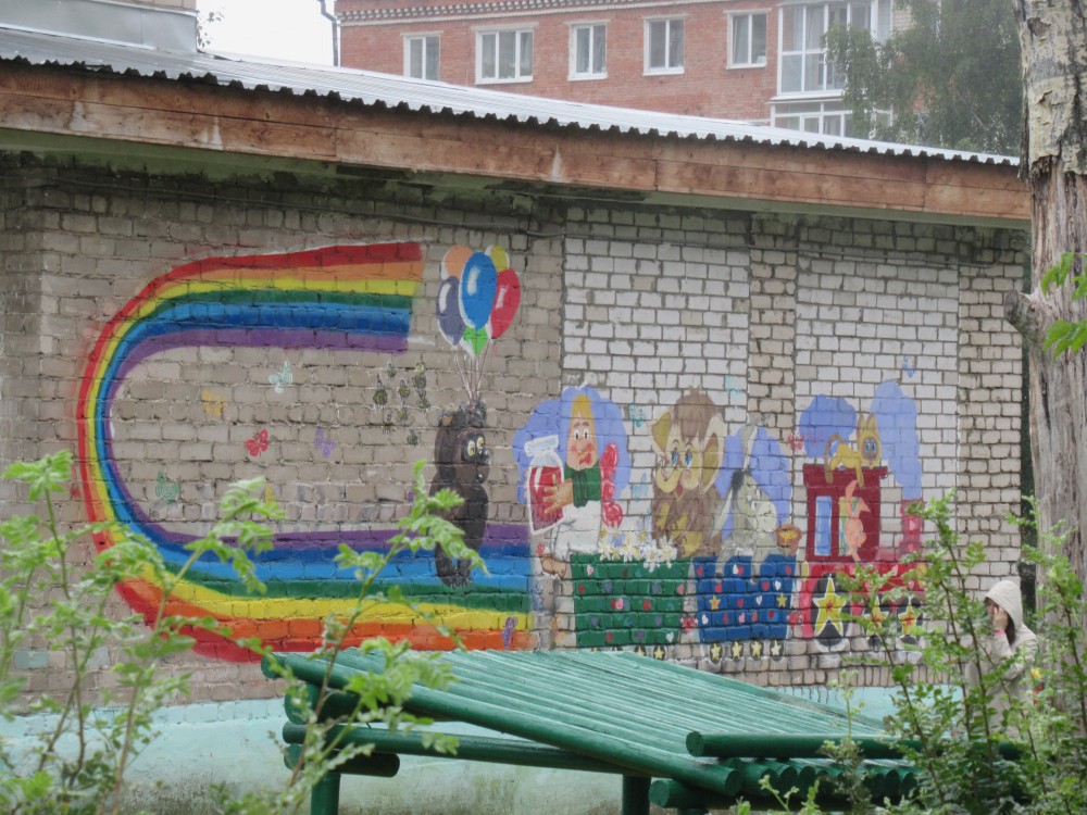 Ладно хоть веселые яркие картинки на стенах некоторых учреждений города добавляют немного позитива в наше дождливо-тоскливое настроение! Нарисовано на здании детсада по ул. Большевистской.