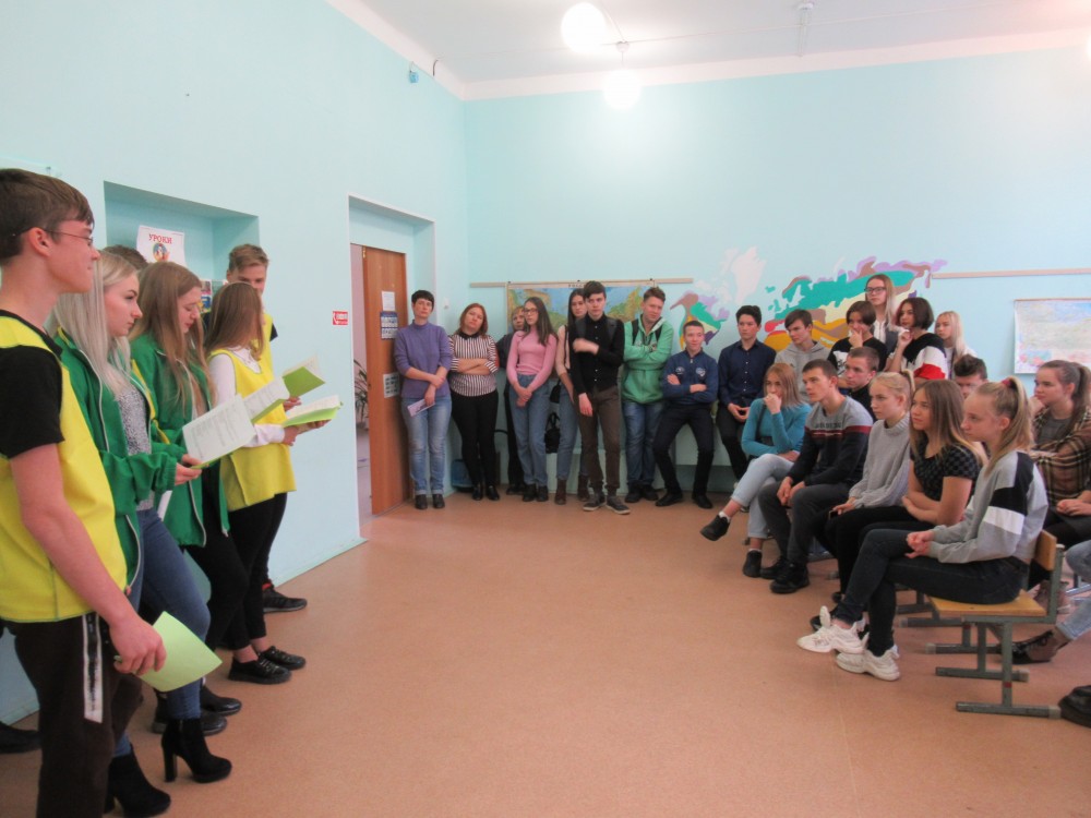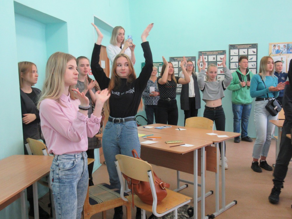 А вот студенты педколледжа погружают школьников в мир своей будущей профессии и показывают, как нужно проводить зарядку в детсаду: