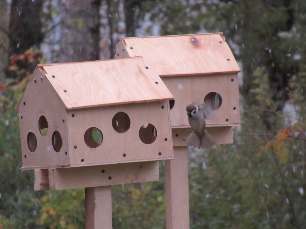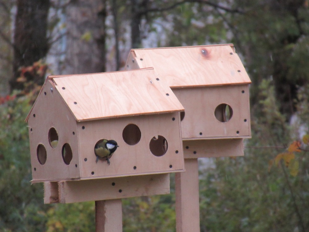 Птичья столовая предназначена для разных птиц — мелких и крупных, а потому есть кормушки разного вида. И даже специальные штыри для сала, которым любят лакомиться синички.