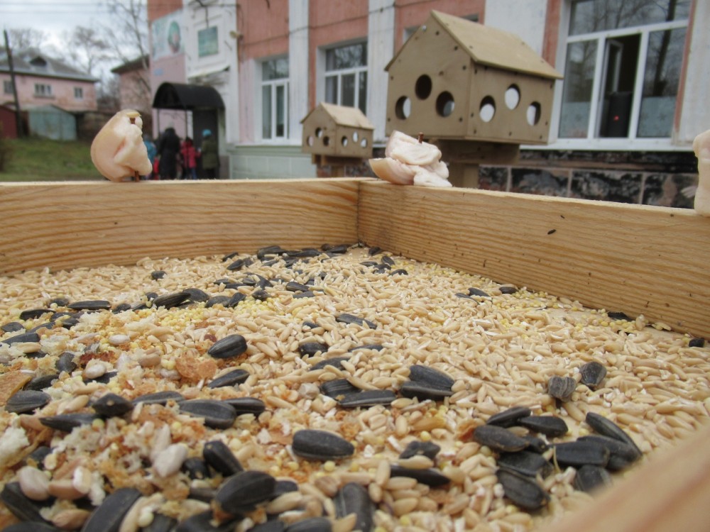 Около кормушек установлена информационная табличка, подсказывающая, чем можно кормить пернатых, а чем — нельзя.