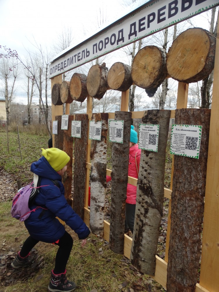 Определитель пород деревьев — интерактивный. Чтобы больше узнать о представленных породах деревьев, нужно навести смартфон со специальной программой на куар-код и вы автоматически попадете на интернет-ресурс с интересным описанием.