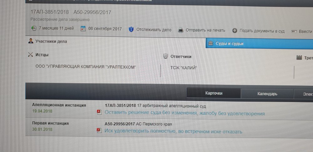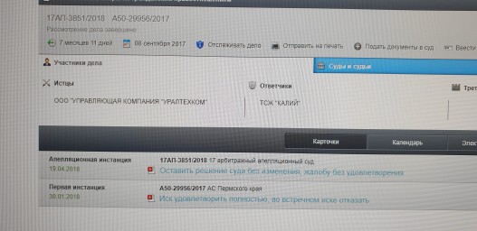 Теперь главное- ООО «УК Уралтехпром „в лице Марины Анатольевны и Евгения Александровича подают в суд на ТСЖ Калий (Дело № А50-29956/17)т.е. на Павла Валерьевича и естественно дело выигрывают — не особо напрягаясь, Павел для вида подает аппеляцию но проигрывает ....