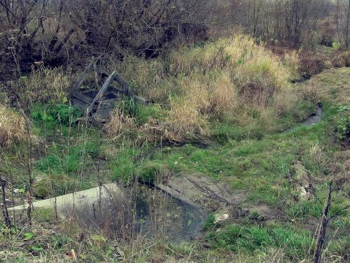 слева от скважины находится старый забытый запущенный колодец, кругом вода, и набросанный хлам