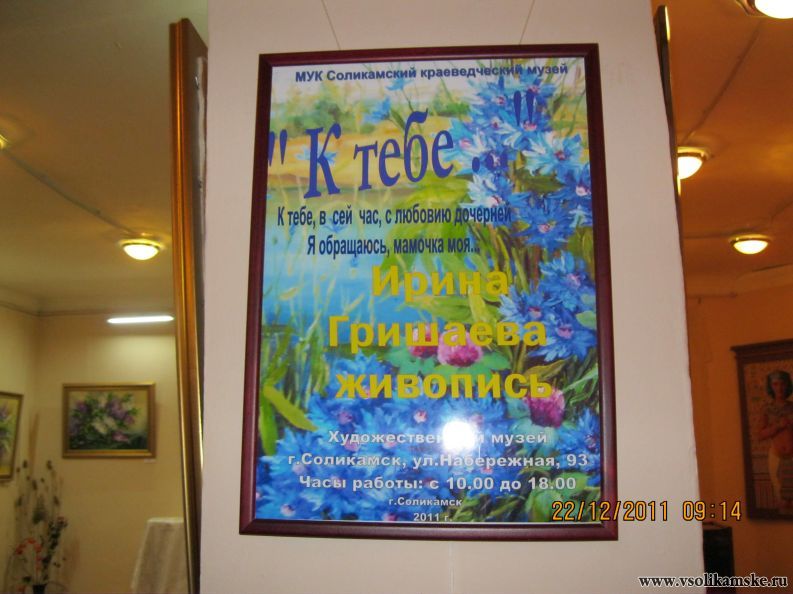 22 декабря мы всем нашим дружным коллективом решили посетить выставку «К тебе» директора детской художественной школы и замечательной соликамской художницы Ирины Гришаевой. Эмоций — масса, и все они позитивные! Как будто в одно мгновение мы оказались на летней цветочной поляне — повсюду ромашки, маки, васильки… Все работы настолько реалистичны, что будто можно почувствовать благоухание цветов...