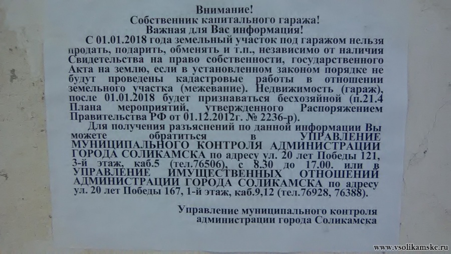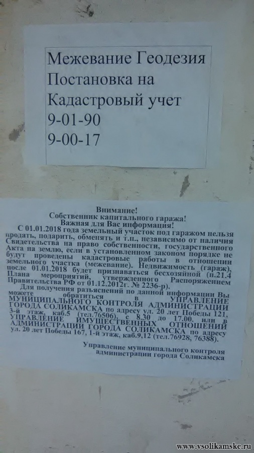 Звонок в контору по межеванию. Там утверждают обратное — то что объявление развесило Управление муниципального контроля. На вопрос, как одновременно с объявлением от "муниципального контроля" на гараже появилось объявление от их конторы — ответ "не знаю". Интересуюсь названием конторы — ООО "Абсолют". Цена за межевание участка — 6.5 тысяч.