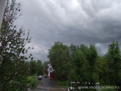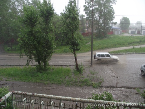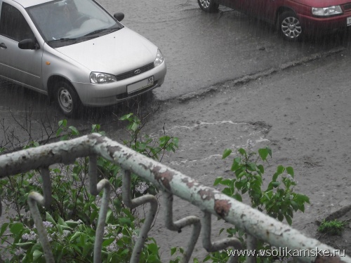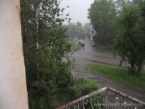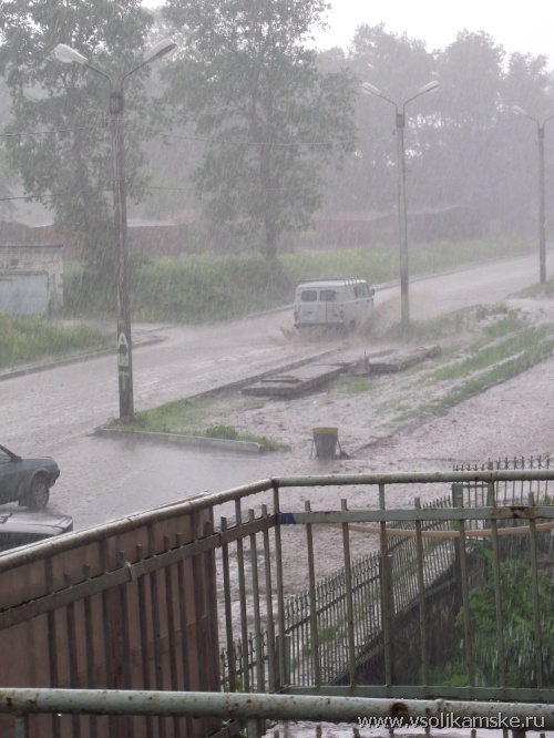 Сказать что был сильный дождь, ничего не сказать. Лило стеной. Небо потемнело. Громыхало так, что срабатывали сигнализации. Был град. Мокрые до нитки люди. Дороги и тротуары превратились в реки. В районы Орбиты наверно образовалось Соликамское озеро :D