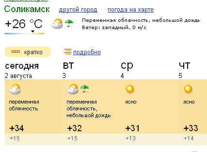 Таки закапало утром с неба. Правда только прибило пыль, прошел, как и написано в прогнозе, небольшой дождь. Посвежело. Правда и Яндекс и Гисметео обещают к концу дня 32-34… Неужели все тучи раздует и опять начнется пекло? :(