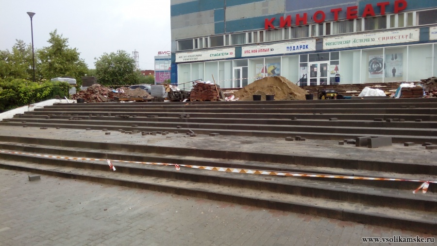 Как было сказано в новости ко Дню города будет поправлен лестничный марш у К/т Русь. Работы идут полным ходом. Лестница перекрыта.