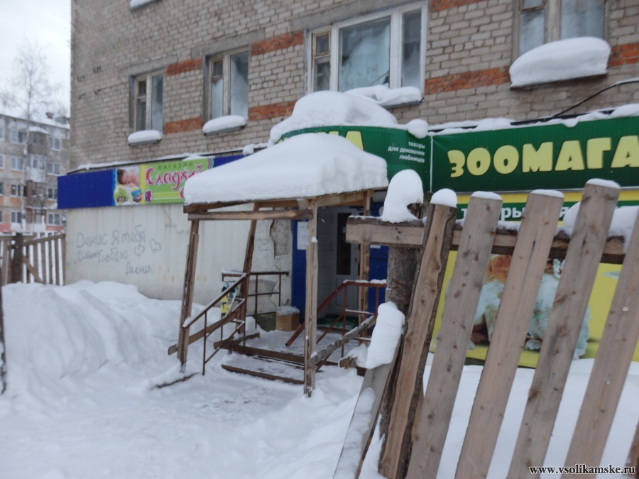Вот общежитие по ул. Степана Разина, что выше магазина "Ермак". Еще больше года назад кирпич из-под его крыши местами обвалился… Сошел одномоментно, лавиной, напугал жителей… Про это был сюжет на СольТВ, я тоже в блоге писала. Что с тех пор изменилось? Ничего. Забор местами разрушен, магазины продолжают функционировать, жильцы живут… И правда, зачем что-то делать, когда и так сойдет! Кстати, в этом здании находятся курсы гражданской обороны. А что, круто — тренировки по поведению в экстренных ситуациях самое то устраивать! вот эта вот "дыра" прям над входом в "гражданскую оборону" Зоомагазин с торца здания "подстраховался" сделали себе деревянное крыльцо но над ними пока обвала кирпичного не было, кирпич выпадывает пошттучно