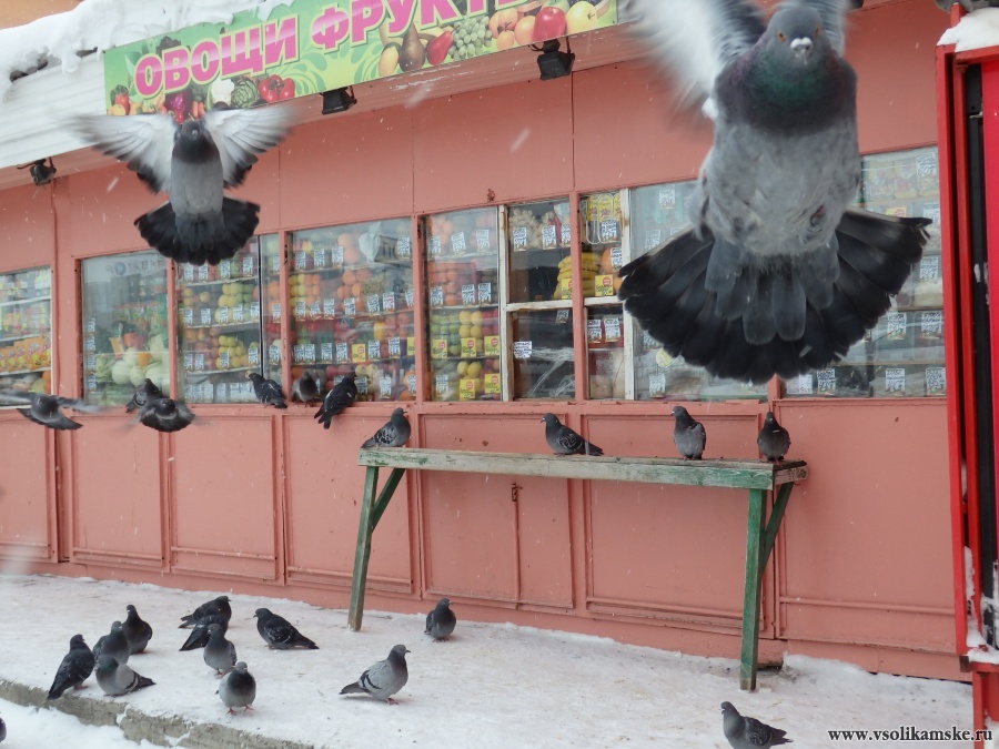 Впрочем, все птицы, зимующие в условиях города, выбирают себе разные способы прокорма. Вот, к примеру, стая голубей, облюбовавших киоск "Фрукты-овощи" в центре — нет-нет что-то да и перепадет!