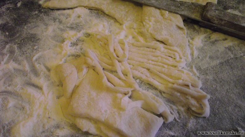 Тесто тонко раскатать, посыпать мукой и нарезать полосками шириной 5-6 см. Полоски теста сложить, примерно, в 6 рядов и, мелко нашинковав, разложить на решето для подсушки, после чего отсеять муку и засыпать лапшу в бульон. На 500 г мяса — 150 г лапши или вермишели, по 1 шт. кореньев и лука, 2 ст. ложки масла.