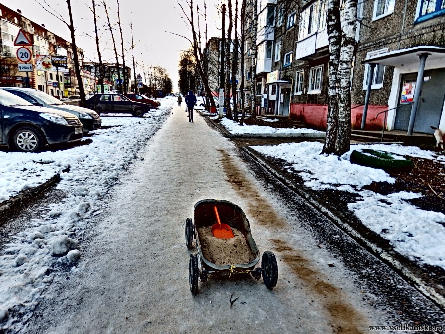При этом подкидывая проблем тем, кто отвечает за городское благоустройство. Но мы ведь тоже не лыком шиты… вот как выглядит механизация ручного труда по-соликамски: берем трактор, насыпаем песок в ковш, сажаем туда двух рабочих, которые на ходу будут раскидывать песок!