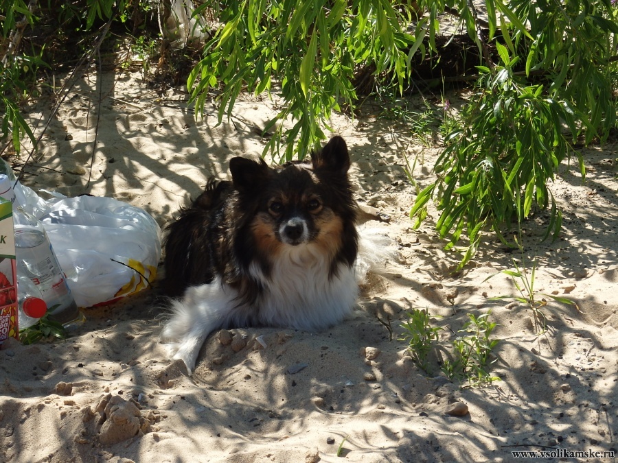 Собака сначала сидела в тени ивы, но когда поняла, зачем нужна палатка… Начала проситься туда)