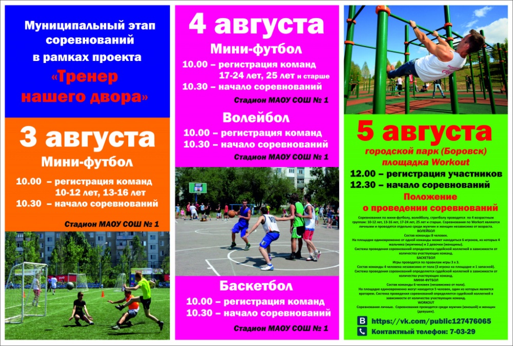 3 и 4 августа с 10:00 на стадионе школы № 1 начнутся игры по мини-футболу. 4 августа с 10:00 на универсальной площадке школы № 1 пройдут соревнования по волейболу, на площадке перед входом в школу состоятся соревнования по баскетболу.