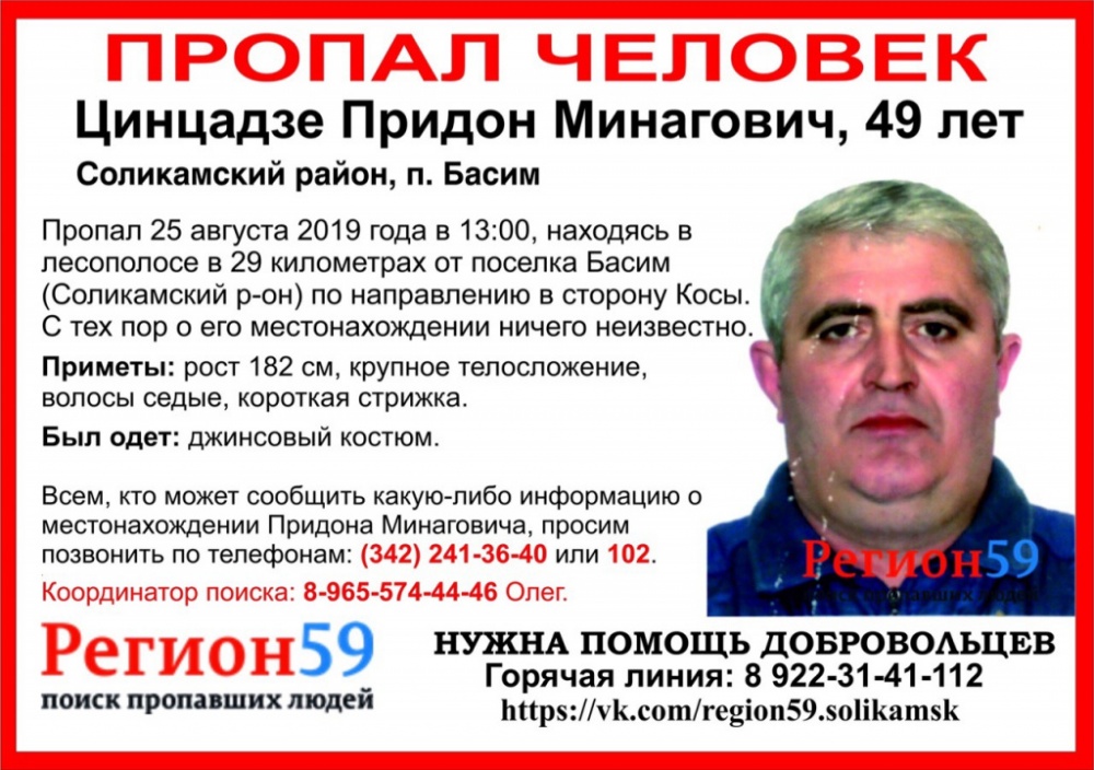 25 августа в 13:00 мужчина находился на лесополосе в 29 километрах от посёлка Басим в направлении Косы. С тех пор о нем ничего не известно.