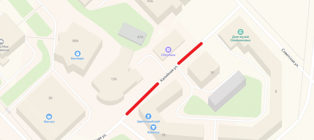— Калийная (от ул.Советская до ул.Всеобуча, вдоль дома № 95 по улице Калийная, вдоль дома № 78 по улице Всеобуча).