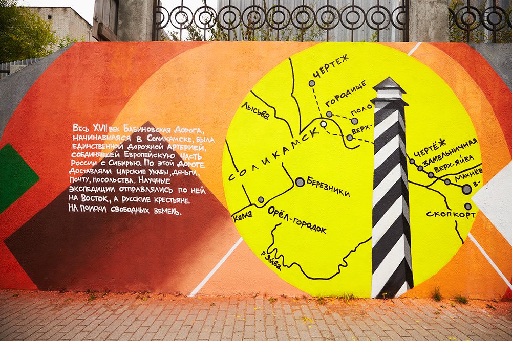 Все объекты в рамках фестиваля уличного искусства, сложились в маршрут-путешествие во времени. Этот маршрут из работ художников переносит в шесть разных веков истории города Соликамска.