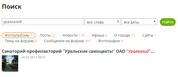 Информация сгруппирована по типам: новости, посты блогов, афиша, сообщения форума и т.п. Нажмите на нужный тип, например, новости, чтобы посмотреть все новости по запросу.