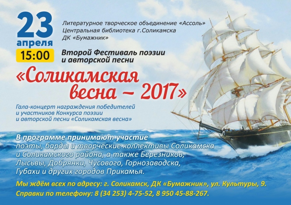 23 апреля в ДК Бумажник пройдет второй фестиваль поэзии и авторской песни Соликамская весна — 2017.