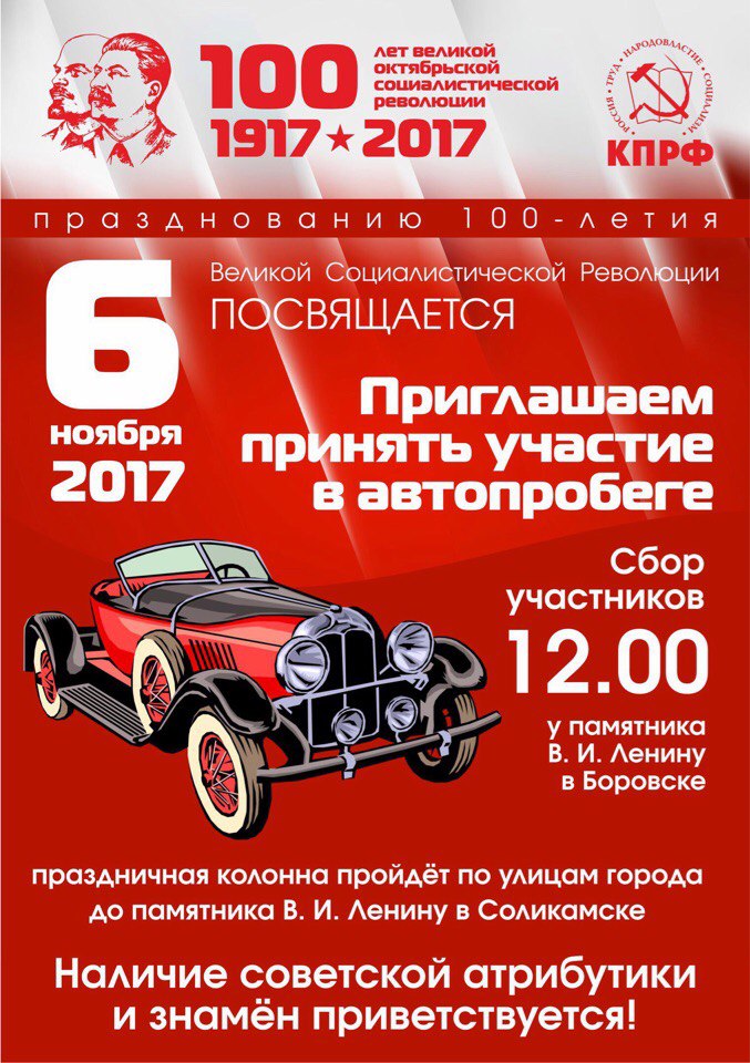 6 ноября 2017 года в Соликамске состоится автопробег, посвященный празднованию 100-летия Великой Социалистической Революции.