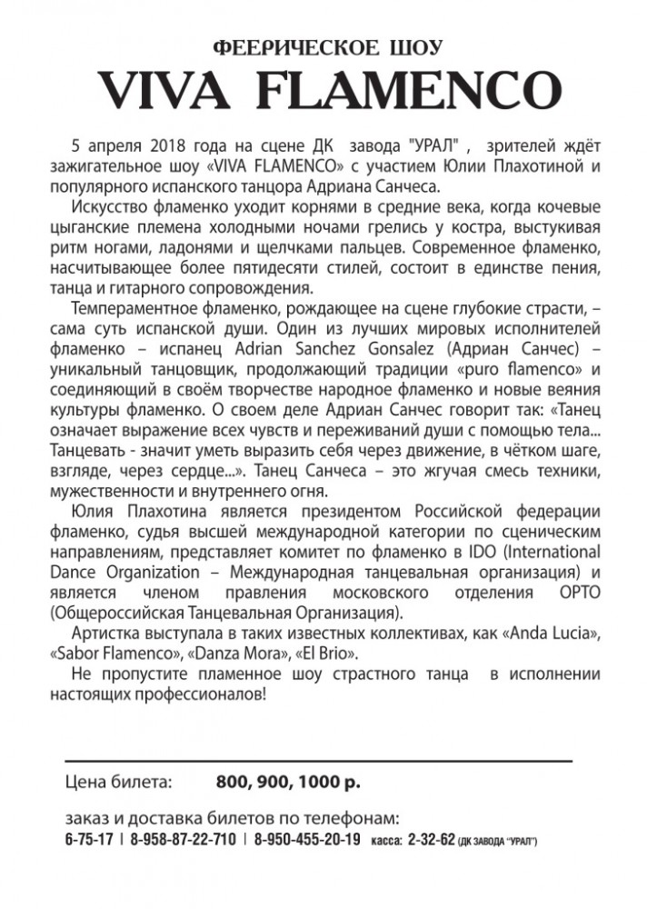 5 апреля в ДК завода Урал пройдет танцевальное шоу «Viva FLAMENCO».