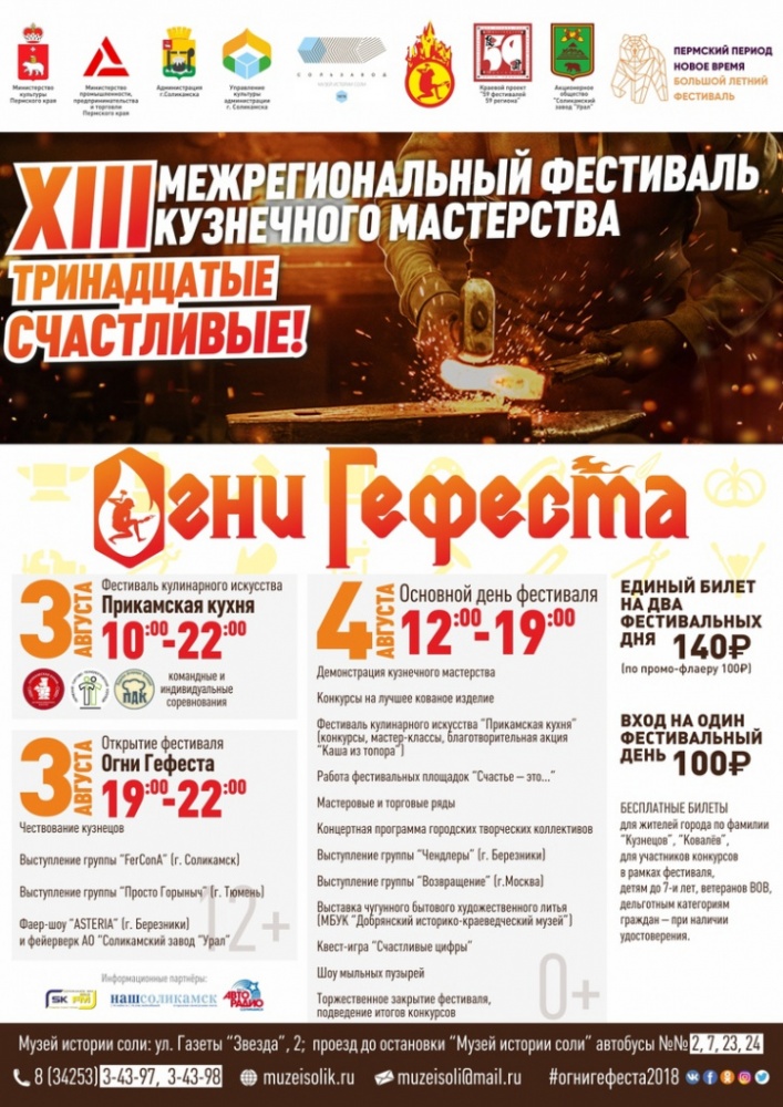 Впервые на нашей территории состоится фестиваль кулинарного искусства «Прикамская кухня»! А затем Музей соли превратится в рок-площадку – для вас выступят группа «Fercona» (Соликамск) и – сюрприз для поклонников – группа «Просто Горыныч» (г. Тюмень)!