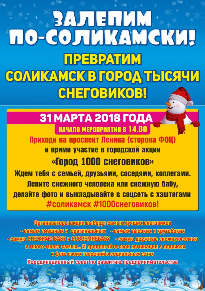 Каждый желающий может прийти и слепить своего снеговика, проявив всю креативность. Главное — после этого выложить фото в социальной сети ВКонтакте с хэштегами #соликамск #1000снеговиков. Самые-самые снеговики и их авторы будут отмечены!